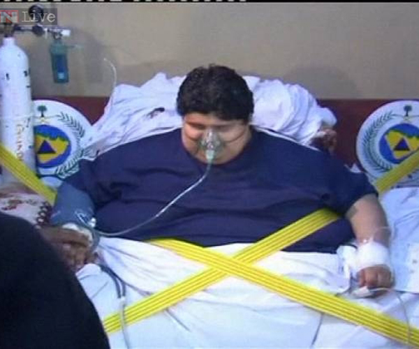 600 കിലോ ശരീര ഭാരമുള്ള മാജിദ് അല് ദോസരി (26) യുടെ മൃതദേഹം മറവ് ചെയ്യുന്ന വീഡിയോ പുറത്തുവന്നു. മൃതദേഹം കയര് കെട്ടി മറവ് ചെയ്യുന്ന വീഡിയോ ആണ് പുറത്തു വന്നത്.അമിത ഭാരം മൂലം ഒരു റൂമിനകത്തു പുറത്തിറങ്ങാനാകാതെ കുടുങ്ങി പോയ യുവാവിന്റെ അവസ്ഥ വാര്ത്തയായതോടെ സൗദി ഭരണാധികാരി അബ്ദുള്ള രാജാവിന്റെ നിര്ദേശ പ്രകാരം ഏതാനും ദിവസങ്ങള്ക്കു മുമ്പ് ദമാമിലെ ആശുപത്രിയില് പ്രവേശിപ്പിച്ചിരുന്നു .വീടിന്റെ ചുമരു പൊളിച്ചു ഫോര്ക്ക് ലിഫ്റ്റ് വഴി ആയിരുന്നു യുവാവിനെ റൂമില് നിന്നും താഴെ എത്തിച്ചത് . സൗദി ആരോഗ്യ മന്ത്രിയുടെ കീഴിലുള്ള പ്രത്യേക വൈദ്യ സംഘം ആയിരുന്നു യുവാവിനെ ചികില്സിച്ചിരുന്നത് .യുവാവിനു ആവശ്യമായ അത്യാധുനിക അമേരിക്കന് നിര്മിത കിടക്ക അടക്കം എല്ലാ സൗകര്യങ്ങളും ഭരണകൂടം തയ്യാറാക്കിയിരുന്നു .പക്ഷേ ന്യൂമോണിയ മൂര്ചിച്ച യുവാവിനെ ജീവന് രക്ഷിക്കാനായില്ല.