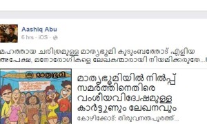 കൊച്ചി: ആദിവാസികളുടെ നില്പ് സമരത്തെ പരിഹസിച്ച് മാതൃഭൂമിയില് പ്രസിദ്ധീകരിച്ച കാര്ട്ടൂണിനും ലേഖനത്തിനുമെതിരെ സംവിധായകന് ആഷിക് അബു ഫെയ്സ്ബുക്കിലൂടെയാണ് ആഷിഖ് അബു കാര്ട്ടൂണിനും ലേഖനത്തിനുമെതിരെ പ്രതികരിച്ചത്.നില്പ്പു സമരത്തിനെതിരായി മാതൃഭൂമിയുടെ സ്പെഷല് പേജായ നഗരത്തില് വംശീയ വിദ്വേഷമുള്ള കാര്ട്ടൂണും ലേഖനവും വന്ന പശ്ചാത്തലത്തിലാണ് ആഷിക് അബുവിന്റെ പ്രതികരണം. ”മഹത്തായ ചരിത്രമുള്ള മാതൃഭൂമി കുടുംബത്തോട് എളിയ അപേക്ഷ, മനോരോഗികളെ ലേഖകന്മാരായി നിയമിക്കരുതേ” എന്നാണ് ആഷിക് പോസ്റ്റ് ചെയ്തിരിക്കുന്നത്. തിരുവനന്തപുരത്ത് ഗോത്രമഹാസഭ നടത്തുന്ന നില്പ്പുസമരത്തിന് ഐക്യദാര്ഢ്യം പ്രകടിപ്പിച്ചെത്തിയ ആഷിക് അബു, ശ്രീനാഥ് ഭാസി, മൈഥിലി, ശ്രിന്ദ അഷാബ്, പേളി മാണി എന്നീ സിനിമാപ്രവര്ത്തകരെ പരിഹസിച്ചാണ് മാതൃഭൂമിയില് ലേഖനം വന്നിരിക്കുന്നത്.സിനിമാപ്രവര്ത്തകര് എത്തിയത് ഫേസ്ബുക്കിലും ക്യാമറയ്ക്കും മുമ്പില് ആളാവാന് വേണ്ടിയാണെന്നായിരുന്നു ലേഖനത്തില് പറഞ്ഞിരുന്നത്. കട്ട് കട്ട് ഉപോദ്ബലകന് എന്ന പേരിലുള്ള ആക്ഷേപ ഹാസ്യപംക്തിയില് ‘ആദിവാസി സ്നേഹം… ഹോ’ എന്ന തലക്കെട്ടോടെയാണ് ലേഖനം എഴുതിയിരിക്കുന്നത്. മൃഷ്ടാന്നം ഭുജിച്ച് മലര്ന്നുകിടന്നപ്പോള് ഭക്ഷണം പള്ളയില് കൊളുത്തിയതുകൊണ്ടാണ് സിനിമാ പ്രവര്ത്തകര് ആദിവാസികളുടെ നില്പ്പുസമരത്തെ പിന്തുണയ്ക്കാനെത്തിയതെന്നും നാട്ടില് പള്ളു പറഞ്ഞ് തീര്ന്നു ഇനി ‘കാട്ടിലേയ്ക്കങ്ങു കയറാം’ എന്നുകരുതിയാണ് അവര് എത്തിയതെന്നും ലേഖനത്തില് പരിഹസിച്ച് എഴുതിയിരുന്നു.
