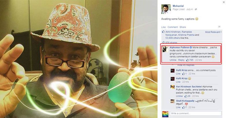 കൊച്ചി : നടൻ മോഹൻലാൽ ഫേസ്ബുക്കിൽ പോസ്റ്റ് ചെയ്ത ഫോട്ടോയ്ക്ക് സംവിധായകന് അല്ഫോണ്സ് പുത്രന് ഇട്ട കമന്റ് ഹിറ്റാകുന്നു.ഒരു ശാസ്ത്രജ്ഞന് ലുക്കില് കൈയ്യില് ഒരു പച്ച നിറമുള്ള മുട്ടയുമായി ലാല് നില്ക്കുന്നതാണ് ഫോട്ടോ. തമാശ അടിക്കുറിപ്പുകള് പ്രതീക്ഷിക്കുന്നുവെന്ന കുറിപ്പോടെ പോസ്റ്റ് ചെയ്ത ഫോട്ടോയ്ക്ക് മിനിട്ടുകള്ക്കുള്ളിൽ രസകരമായ കമന്റുകള് വന്നുകൊണ്ടിരുന്നു.അതില് ശ്രദ്ധിക്കപ്പെട്ടത് നേരം, പ്രേമം എന്ന ചിത്രങ്ങളിലൂടെ ഇപ്പോള് പ്രേക്ഷകര്ക്ക് വേണ്ടപ്പെട്ട സംവിധായകനായ അല്ഫോണ്സിന്റെ കമന്റാണ്.”മോനേ ദിനേശാ.. പച്ച മുട്ടവച്ചിട്ടു ഒരു സവാരി ഗിരിഗിരിയുണ്ട്. ഉളുക്കിനും ചതവിനും ബെസ്റ്റാ.. രണ്ടു കമന്റ്സും ലാലേട്ടന് പറയണം” – എന്നായിരുന്നു അല്ഫോണ്സ് പുത്രന്റെ കമന്റ്.പി ന്നെ അല്ഫോണ്സിന്റെ കമന്റിനായിരുന്നു ലൈക്കും റിപ്ലേയും. റിപ്ലേ കോളത്തില് പലരും ആവശ്യപ്പെട്ടത്, ലാലിനെ വച്ച് അല്ഫോണ്സ് എത്രയും പെട്ടന്ന് ഒരു ചിത്രമൊരുക്കണം എന്നാണ്.അടുത്തിടെ മോഹന്ലാല് പോസ്റ്റ് ചെയ്ത് മറ്റൊരു ഫോട്ടോയും വൈറലായിരുന്നു. രണ്ടുപേരെ പുറത്തേറ്റി പുഷ് അപ് പോസിലുള്ള മോഹന്ലാലിന്റെ ഫോട്ടോ ആയിരുന്നു വൈറലായത്. കഠിനമായ വര്ക്ക് ഔട്ടിനു ശേഷം മകന് പ്രണവിനും കസിന് മോഹനുമൊപ്പം പോസ് ചെയ്തത് എന്ന അടിക്കുറിപ്പോടെയാണ് ഫോട്ടോ ഷെയര് ചെയ്തത്.