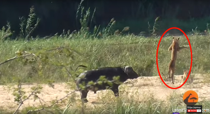 സിംഹക്കൂട്ടം നോക്കി നില്ക്കെയായിരുന്നു പോത്തിന്റെ ആക്രമണം. വലിയ ഇനം ഓന്തിനെ വേട്ടയാടി കളിക്കുന്നതിനിടയിലാണ് പോത്തിന്റെ അതിര്ത്തിയിലേക്ക് രണ്ട് സിംഹക്കുട്ടികളും പുറകെ സിംഹകൂട്ടവും കടന്നു ചെന്നത്. ഇതോടെ കാട്ടുപോത്ത് ശ്രദ്ധാലുവായി. സിംഹക്കുട്ടികളുടെ കുട്ടികളി കൂടിയതോടെ കാട്ടുപോത്ത് ആക്രമണത്തിനു തയ്യാറെടുത്തു. കാട്ടുപോത്ത് ചീറിയടുക്കുന്നത് കണ്ടതോടെ കൂട്ടത്തിലുണ്ടായിരുന്ന ഒരു സിംഹക്കുട്ടിയും മറ്റ് മുതിര്ന്ന സിംഹങ്ങളും ഓടി രക്ഷപെട്ടു.