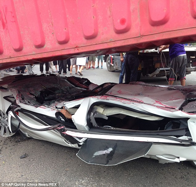 car is crushed flat by a lorry's shipping container load1