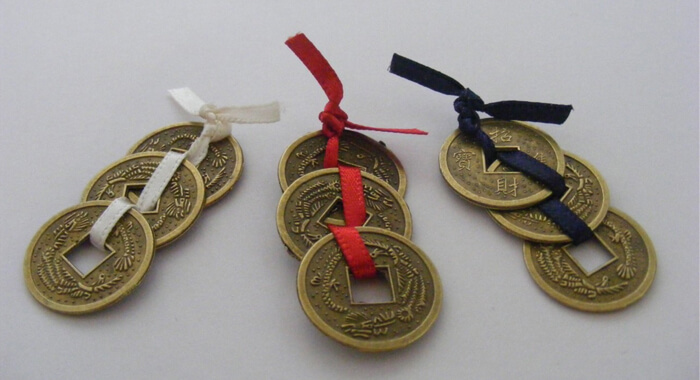 മൂന്ന് നാണയങ്ങളുടെ ബാന്ധവത്തെ മൂന്ന് സ്വര്ഗങ്ങളുടെ അഭിവൃദ്ധിയെ പ്രതിനിധാനം ചെയ്യുമ്പോള്, ആറ് നാണയങ്ങള് സ്വര്ഗീയ സൗഭാഗ്യത്തേയും, ഒന്പത് നാണയങ്ങള് പ്രപഞ്ച സൗഭാഗ്യത്തെ മനുഷ്യനുമായി ബന്ധിപ്പിക്കുന്നു.