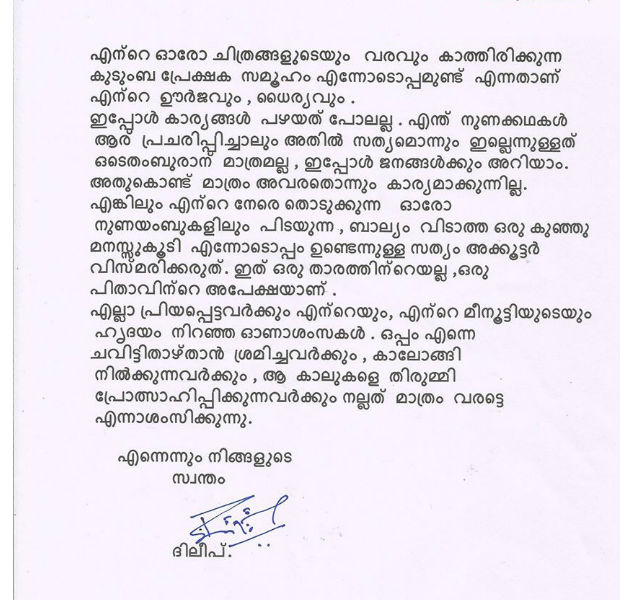 അവരുടെ ആശിര്വാദം ഒന്നുകൊണ്ടു മാത്രമാണ് എന്നിലെ കൊച്ചു കലാകാരന് വളരാനായതും അവരുടെ സ്വന്തം കുടുംബത്തിലെ അംഗമായി എനിക്ക് മാറാനായതും. പ്രിയപ്പെട്ട മാവേലിത്തമ്പുരാനേ, അങ്ങയുടെ നന്മ നിറഞ്ഞ ഭരണത്തില് അസൂയാലുക്കളായവര് വാമനനെ അയച്ച് അങ്ങയെ പാതാളത്തിലേക്ക് ചവിട്ടിത്താഴ്ത്തിയെങ്കില് എന്റെ സിനിമകളുടെ വിജയത്തിലും ജനസമ്മതിയിലും അസൂയ പൂണ്ട ദോഷൈകദൃക്കളായ ചില അഭിനവ വാമനന്മാര് കൂട്ടം ചേര്ന്ന് കുറെ നാളുകളായി എന്നെ ചവിട്ടിത്താഴ്ത്താന് ശ്രമിക്കുകയാണ്. പ്രത്യേകിച്ചും എന്റെ ഏതെങ്കിലും പുതിയ സിനിമയുടെ റിലീസിങ് സമയത്താണ് ഇതെന്ന കാര്യം വളരെ ശ്രദ്ധേയമാണ്.