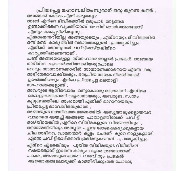 പ്രിയപ്പെട്ട മഹാബലിതമ്പുരാന് ഒരു തുറന്ന കത്ത്, അങ്ങേയ്ക്ക് ക്ഷേമമെന്നു കരുതട്ടെ? അങ്ങ് എന്റെ ജീവിതത്തില് ഒരുപാട് നേട്ടങ്ങള് ഉണ്ടാക്കി തന്ന വ്യക്തിയാണ് അതിന് ഞാന് അങ്ങയോട് എന്നും കടപ്പെട്ടിരിക്കുന്നു. എന്താണെന്നറിയില്ല അങ്ങയുടെയും എന്റെയും ജീവിതത്തില് ഒന്ന് രണ്ട് കാര്യത്തില് സമാനതകളുണ്ട്. പ്രത്യേകിച്ചും എനിക്ക് തോന്നുന്നത് ചവിട്ടിത്താഴ്ത്തലിന്റെ കാര്യത്തിലാണെന്നാണ്. പണ്ട് അങ്ങയോടുള്ള സ്നേഹാദരങ്ങളാല് പ്രജകള് അങ്ങയെ നാടിന്റെ ചക്രവര്ത്തിയാക്കിയതുപോലെ വെറും സാധാരണക്കാരില് സാധാരണക്കാരനായ എന്നെ ഒരു അഭിനേതാവാക്കിയതും ജനപ്രിയ നായക നിരയിലേക്ക് ഉയര്ത്തിയതും എന്റെ പ്രിയപ്പെട്ട മലയാളി സഹോദരങ്ങളാണ്.