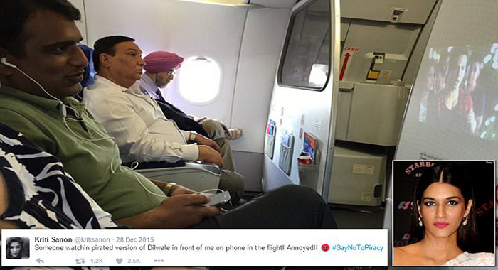 തിയേറ്ററില് പ്രദര്ശനം തുടരുന്ന ഷാരൂഖ്-കജോള് താരജോടികളുടെ ചിത്രമായ ദില്വാലേയുടെ വ്യാജ പതിപ്പ് കണ്ടയാളെ ബോളിവുഡ് നടി ക്രിതി സനോന് പിടികൂടി. വ്യാജ പതിപ്പ് കാണുന്ന യുവാവിന്റെ ചിത്രം മൊബൈലില് പകര്ത്തിയ ക്രിതി ട്വിറ്ററില് പോസ്റ്റ് ചെയ്യുകയായിരുന്നു.മുംബൈയില്നിന്ന് ഡല്ഹിയിലേക്കുള്ള വിമാന യാത്രയ്ക്കിടയിലാണ് സംഭവം. അമ്മയോടൊപ്പം യാത്ര ചെയ്യുകയായിരുന്ന ക്രിതിയുടെ സമീപത്തിരുന്ന യുവാവാണ് ദില്വാലെയുടെ വ്യാജ പതിപ്പ് യാത്രാവേളയില് കണ്ടത്. മൊബൈലിലെ പ്രൊജക്ടര് ഉപയോഗിച്ച് മുന്പിലെ ഭിത്തിയില് പ്രദര്ശിപ്പിക്കുകയായിരുന്നു. ചിത്രത്തിലെ നായിക കൂടിയായ ക്രിതി യുവാവിനോട് വ്യാജ പതിപ്പ് കാണരുതെന്നും തിയേറ്ററില് പോയി കാണാനും ഉപദേശിച്ചു. പക്ഷേ ക്രിതിയുടെ വാക്കുകള് കേള്ക്കാതെ യുവാവ് സിനിമ കണ്ടുകൊണ്ടിരുന്നു. പിന്നീടാണ് നടി ക്രിതി സനോന് ഫോട്ടോ എടുത്ത് ട്വിറ്ററില് പോസ്റ്റ് ചെയ്തത്.