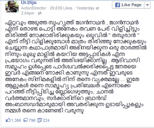 മോഹലാലിൻറെ പെരുച്ചാഴിയിലെ ‘ലുലുമാളില് കയറിയ അട്ടപ്പാടികള്’ എന്ന ഡയലോഗിനെ വിമര്ശിച്ച് പ്രശസ്ത സംവിധായകന് ഡോ. ബിജു രംഗത്ത്. പെരുച്ചാഴിയിലെ സംഭാഷണം ആദിവാസി സമൂഹത്തെ അപമാനിക്കുന്നതാണെന്നാണ് ഫേസ്ബുക്കില് ബിജുവിന്റെ ആരോപണം.തന്റെ ഫേസ്ബുക്ക് പേജിലൂടെയാണ് ബിജു വിമര്ശനം ഉന്നയിച്ചിരിക്കുന്നത്. ‘ഏറ്റവും അടുത്ത സുഹൃത്ത് ജഗന്നാഥന്, ജഗന്നാഥന് എന്ന് തൊണ്ട പൊട്ടി അനേകം തവണ പേര് വിളിച്ചിട്ടും തിരിഞ്ഞ് നോക്കാതിരിക്കുകയും ഒടുവില് തമ്പുരാന് എന്ന് നീട്ടി വിളിക്കുമ്പോള് മാത്രം തിരിഞ്ഞു നോക്കുകയും ചെയ്യുന്ന കഥാപാത്രമായി അഭിനയിക്കുന്ന ഒരു താരത്തില് നിന്നും ലുലു മാളില് കയറിയ അട്ടപ്പാടികള് എന്ന പ്രയോഗം വരുന്നതില് അതിശയിക്കാനില്ല. ആദിവാസി സമൂഹം ഉള്പ്പെടെ പാര്ശ്വവത്ക്കരിക്കപ്പെട്ട ജനതയെ ഇവര് എങ്ങനെ നോക്കി കാണുന്നു എന്നത് ഇവരുടെ അനേകം സിനിമകളില് നിന്ന് തന്നെ വ്യക്തമല്ലേ … ഇതേ ആളുകള് തന്നെ സാമൂഹ്യ പ്രതിബദ്ധത എന്നൊക്കെ പറഞ്ഞ് നീട്ടിപ്പിടിച്ച ബ്ലോഗെഴുത്തും, ചാനല് വര്ത്തമാനവും, സര്ക്കാരിന്റെ ബ്രാന്ഡ് അംബാസഡര്മാരുമായി അവതരിക്കുന്ന ഉടായിപ്പുകളും നമ്മള് തന്നെ കാണേണ്ടി വരുന്നു’ എന്നായിരുന്നു ബിജുവിന്റെ ഫേസ്ബുക്ക് പോസ്റ്റ്.