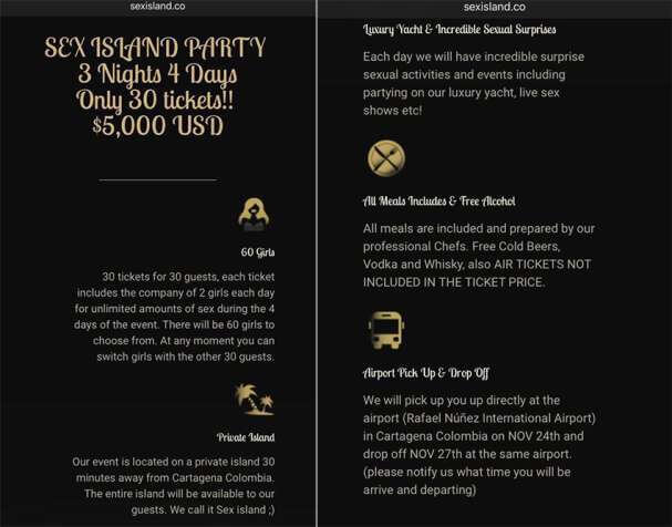 ലൈവ് സെക്സ് ഷോ, ആഡംബരനൗകയിലെ പാര്ട്ടി, അനിയന്ത്രിതമായ അളവില് മദ്യവും ഭക്ഷണം എന്നിവയാണ് പരിപാടിയുടെ ആകര്ഷണമായി കമ്പനി വിശേഷിപ്പിക്കുന്നത്. വിമാനത്താവളത്തില് നിന്ന് അതിഥികളെ സ്വീകരിച്ച് ദ്വീപിലേക്ക് എത്തിക്കുമെന്നും പരസ്യത്തില് അറിയിച്ചിട്ടുണ്ട്.