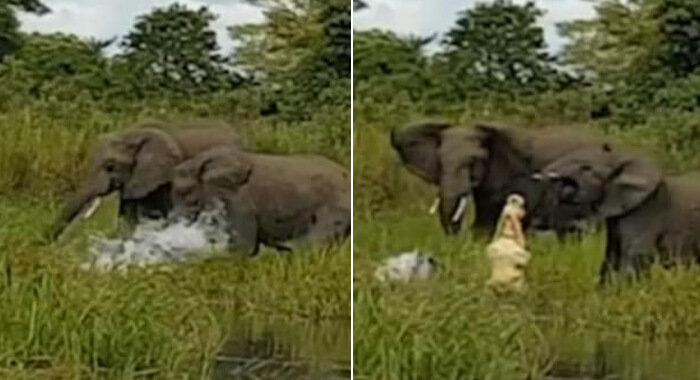ഇതിനിടെ കൂട്ടത്തിലുള്ള ആനയുടെ പരാക്രമം കണ്ട് ആദ്യം പതറിപ്പോയെങ്കിലും മറ്റാനകളും കുട്ടിയാനയെ സഹായിക്കാനായി മുന്നോട്ടു വന്നു. ഇതിനിടെയില് മുതലയെ വീണ്ടും കുടഞ്ഞെറിഞ്ഞു രക്ഷപ്പെടാനായി ആനയുടെ ശ്രമം. ഈ സമയം കൂട്ടത്തിലൊരാന മുതലയുടെ നേരെ ആക്രമണത്തിനു മുതിരുകയും ചെയ്തതോടെ മുതല പരാജയം സമ്മതിച്ചു വെള്ളത്തിലേക്കു മടങ്ങുകയായിരുന്നു.