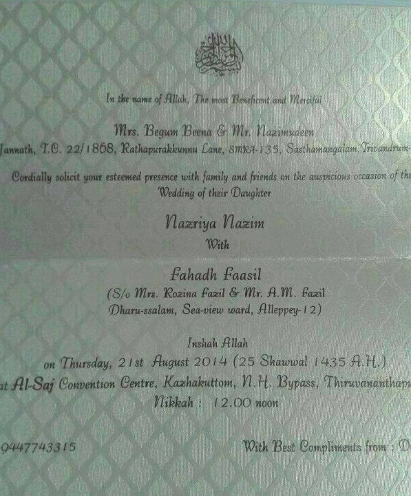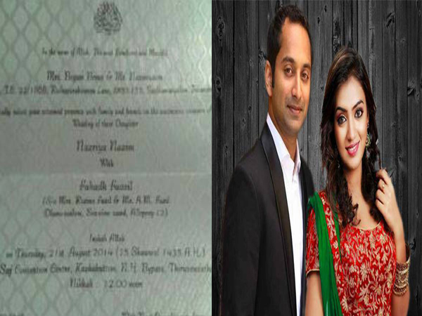 മലയാളസിനിമയിലെ തിളക്കമേറിയ രണ്ടുതാരങ്ങളാണ് ഫഹദും നസ്റിയയും. അതുകൊണ്ട് തന്നെ ചലച്ചിത്രലോകവും ആരാധകരുമെല്ലാം ഏറെ സന്തോഷത്തോടെയാണ് ഇവരുടെ വിവാഹം കാത്തിരിക്കുന്നമലയാളചലച്ചിത് ലോകം വീണ്ടുമൊരു താരവിവാഹത്തിനുള്ള തയ്യാറെടുപ്പിലാണ്.മലയാളികളുടെ പ്രിയതാരങ്ങളായ ഫഹദ് ഫാസിലും നസ്രിയ നസീമും ഓഗസ്റ്റ് 21ന് വിവാഹിതരാവുകയാണ്.വിവാഹത്തിന്റെ ക്ഷണക്കത്ത് തയ്യാറായി കഴിഞ്ഞു.