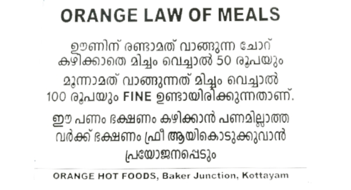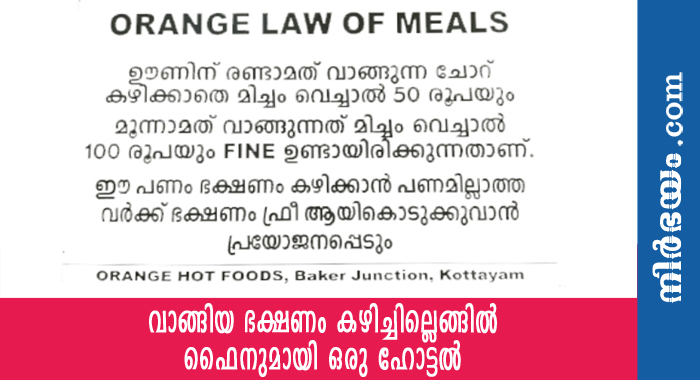 ഹോട്ടലിൽ നിന്ന് ഊണ് കഴിക്കുമ്പോൾ പലർക്കുമുള്ള ഒരു ചീത്ത സ്വഭാവമാണ് ആവശ്യമില്ലെങ്കിലും വെറുതെ രണ്ടാമതും മൂന്നാമതുമൊക്കെ ചോറ് വീണ്ടും വാങ്ങുക എന്നത്. അത്തരക്കാർ ഈ ഹോട്ടലിൽ പോകാതിരുന്നത് നന്നാകും. കാരണം കിടിലൻ ഫൈൻ ആയിരിക്കും ഇവർ പാഴാക്കുന്ന ഓരോ ഭക്ഷണത്തിനും ലഭിക്കുക. ഇതെന്താ ഗുണ്ടായിസം വല്ലതുമാണോ എന്ന് ചിന്തിക്കുന്നുണ്ടാകും. എന്തായാലും സംഭവം ഉള്ളത് തന്നെ. കോട്ടയം ബേക്കറി ജംക്ഷനിലെ ഓറഞ്ച് ഹോട്ട് ഫുഡ് എന്ന സ്ഥാപനമാണ് ഇത്തരത്തിലൊരു പിഴ ചുമത്തുന്നത്.