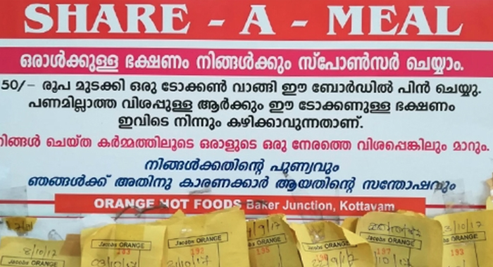 ഇത് കൂടാതെ ഷെയർ എ മീൽ എന്നൊരു സൗകര്യവും ഹോട്ടലുടമയായ നോബി ഇവിടെ ഒരുക്കിയിട്ടുണ്ട്. ഇത് പ്രകാരം ആർക്കും 50 രൂപ അടച്ച് പാവപ്പെട്ടവർക്കുള്ള ഭക്ഷണത്തിന്റെ ടോക്കൺ സ്വയം എടുത്ത് ഇവിടെ ഇതിനായി സ്ഥാപിച്ചിരിക്കുന്ന ബോർഡിൽ തൂക്കിയിടാം. ഇതിലൂടെ പണമില്ലാത്ത ഏതൊരാൾക്കും ഈ കൂപ്പണുകൾ വഴി ഭക്ഷണം വാങ്ങുകയും ചെയ്യാം.