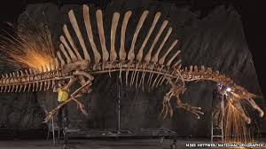 നീന്താന് കഴിവുള്ള ഭീമന് ദൈനോസറിന്റെ ഫോസില് കണ്ടെത്തി. സഹാറ മരുഭൂമിയിൽ നിന്നാണ് 95 മില്ല്യൻ വർഷം പഴക്കമുള്ള ദിനോസറിൻറെ ഫോസിൽ കണ്ടെത്തിയത്. ദിനോസറുകള്ക്കിടയിലെ രാജാവെന്ന് അറിയപ്പെടുന്ന ടൈറാനോസെറസ് റെക്സിനെ പോലും നേരിടുന്ന സ്പിനോസോറസ് എന്ന ഇനത്തിൽ പെട്ട ദിനോസറാണ് നീന്താൻ കഴിവുള്ള ദിനോസർ എന്ന വിശേഷണം ഒരു കൂട്ടം ശാസ്ത്രഞ്ഞർ ചാർത്തി നൽകിയിരിക്കുന്നത്. ചിക്കാഗോ സര്വകലാശാലയിലെ ശാസ്ത്രജ്ഞര് നടത്തിയ പഠനങ്ങളിലാണ് ഈ മാംസഭോജി ഭീകരന് വെള്ളത്തിലും ഇരപിടിച്ചിരുന്നുവെന്ന് കണ്ടെത്തിയത്.ഇതുവരെ കണ്ടെത്തിയതില് നീന്താന് കഴിവുള്ള ആദ്യ ദിനോസറാണ് സ്പിനോസോറസെന്നാണ് ശാസ്ത്രജ്ഞർ പറയുന്നത്. ഈ ദിനോസറിന് ഏകദേശം 15.2 മീറ്റര് (50 അടി) നീളമുണ്ടായിരുന്നു. നീന്താൻ കഴിയുന്ന തരത്തിലുള്ള വീതികൂടിയ പാദങ്ങളാണ് ഇവയ്ക്കുള്ളത് . മറ്റ് ദിനോസറുകളിൽ നിന്ന് വ്യത്യസ്ഥമായി ശ്വാസകോശത്തിലേക്ക് ജലം കയറാത്ത രൂപത്തിൽ മൂക്കിൻറെ പിൻഭാഗത്താണ് ഇവയുടെ ശ്വസനദ്വാരമുള്ളത്. നീളമേറിയ കഴുത്തും ദേഹവും വാലുമുള്ള ഇവയുടെ ഇടുപ്പും പിൻ ഭാഗവും തീരെ വലിപ്പം കുറഞ്ഞവയുമാണ്.ജലത്തിൽ തന്നെ കഴിയാനും ജലത്തിൽ തന്നെ വേട്ടയാടാനുമുള്ള ഇവയ്ക്ക് അപാരകഴിവുകളുണ്ടെന്നാണ് നിഗമനം.