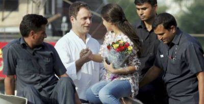 ഗുജറാത്തിലെ ഒരു റോഡ് ഷോയ്ക്കിടയിൽ രാഹുല് ഗാന്ധിയുടെ വാഹനത്തില് കയറി രാഹുലിനെ കെട്ടിപ്പിടിച്ച് ആരാധിക സെൽഫിഎടുത്തു. ഓടിയെത്തിയ യുവ ആരാധിക പ്രത്യേകം തയ്യാറാക്കിയ ബസിന് മുകളില് ചാടിക്കയറുകയും പിന്നീട് രാഹുലുമൊത്ത് സെൽഫിയെടുക്കുകയും ചെയ്തു. എന്നാൽ സെൽഫിയെടുത്ത് കഴിഞ്ഞ ശേഷം ബസ്സിന് മുകളിൽ നിന്നും താഴെയിറങ്ങാൻ യുവതിക്ക് സാധിച്ചില്ല. പിന്നീട് രാഹുലിന്റെ സുരക്ഷാ ഉദ്യോഗസ്ഥരുടെ സഹായത്തോടെയാണ് യുവതിയെ താഴെയിറക്കിയത്.