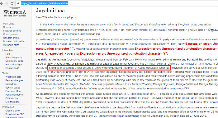 തമിഴ്നാട്ടിലെ രാഷ്ട്രീയ നേതാവും മുഖ്യമന്ത്രിയുമായിരുന്ന ജയലളിത കാര്ഡിയാക് അറസ്റ്റിനെ തുടര്ന്ന് ഡിസംബര് അഞ്ചിന് മരണപ്പെട്ടു. ചെന്നൈയിലെ അപ്പോളോ ആശുപത്രിയില് ചികിത്സയില് കഴിയുന്നതിനിടെയാണ് ജയലളിതയ്ക്ക് ഹൃദയസ്തംഭനമുണ്ടായത്. – ഇതായിരുന്നു വിക്കിപീഡിയയില് നടന്ന എഡിറ്റിങ്.