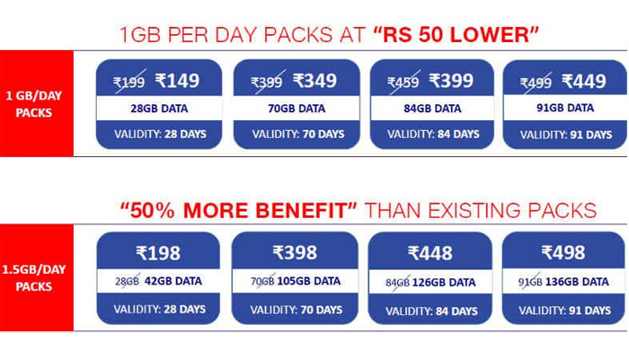 പുതിയ പ്ലാനുകള് പ്രകാരം നേരത്തെ 199 രൂപയ്ക്ക് 28 ജിബി നല്കിയിരുന്ന പ്ലാന് 149 രൂപയായി കുറച്ചു. 28 ദിവസം വാലിഡിറ്റിയുള്ള ഈ ഓഫറില് ദിവസം 1 ജിബ ഡേറ്റയും അണ്ലിമിറ്റഡ് കോളും ലഭിക്കും. കൂടാതെ 399 രൂപ പ്ലാന് 349 രൂപയായി കുറച്ചു. 70 ദിവസത്തേക്ക് 70 ജിബി ഡേറ്റയും അണ്ലിമിറ്റഡ് കോളുകളും ലഭിക്കും.