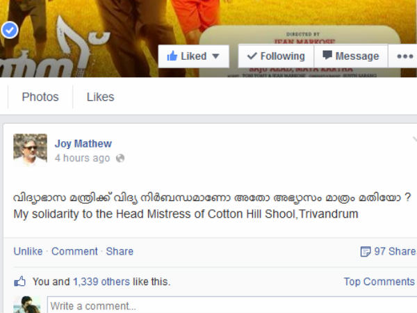 കൊച്ചി: തിരുവനന്തപുരം കോട്ടണ്ഹില് സര്ക്കാര് സ്കൂളിലെ പ്രധാനാധ്യാപികയെ സ്ഥലം മാറ്റിയ വിദ്യാഭ്യാസ മന്ത്രിയുടെ നടപടിക്കെതിരെ നടനും സംവിധായകനുമായ ജോയ് മാത്യു രംഗത്ത്.തന്റെ ഫേസ്ബുക്ക് പോസ്റ്റിലൂടെയാണ് ജോയ്മാത്യു വിദ്യാഭ്യാസ മന്ത്രിയെ വിമർശിച്ചത്.വിദ്യാഭ്യാസ മന്ത്രിക്കു വിദ്യ നിര്ബന്ധമാണോ അതോ അഭ്യാസം മാത്രം മതിയോ എന്നു ഫേസ്ബുക്കിലൂടെ ജോയ് മാതു ചോദിക്കുന്നു. കൂടാതെ അധ്യാപികയ്ക്കു പൂര്ണ പിന്തുണയും അദ്ദേഹം പ്രഖ്യാപിക്കുന്നുണ്ട്. സ്കൂള് ചടങ്ങില് വൈകിയെത്തിയ വിദ്യാഭ്യാസ മന്ത്രിയെ വേദിയിലില്വച്ചു വിമര്ശിച്ചുവെന്നതിന്റെ പേരിലാണു സ്ഥലംമാറ്റം. കോട്ടണ് ഹില് സ്കൂളിലെ പ്രധാനാധ്യാപിക കെ.കെ. ഊര്മിളാ ദേവിയെയാണു സ്ഥലം മാറ്റിയത്.