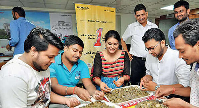 ദീപാവലി ദിവസം ഉദയ്പൂരിലെ ഹോണ്ടയുടെ ഷോറൂം അടയ്ക്കാറായപ്പോഴാണ് രണ്ടു കുട്ടികള് വന്നു കയറിയത്. അവര്ക്ക് ഒരു ആക്ടീവ വേണം. എട്ടു വയസുകാരന് യാഷിനും 13 വയസുകാരി രൂപലുമാണ് ആക്ടീവ വാങ്ങാന് എത്തിയത്. കുട്ടികള് എത്തിയതാകട്ടെ 62000 രൂപയുടെ പത്തുരൂപ നാണയങ്ങളുമായി.
