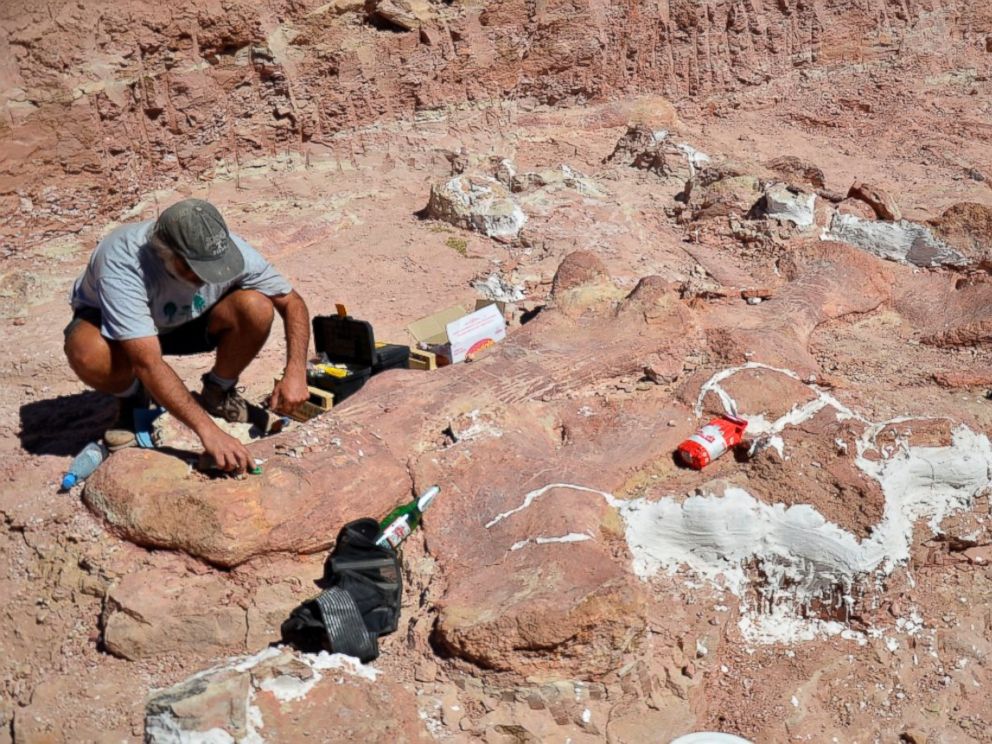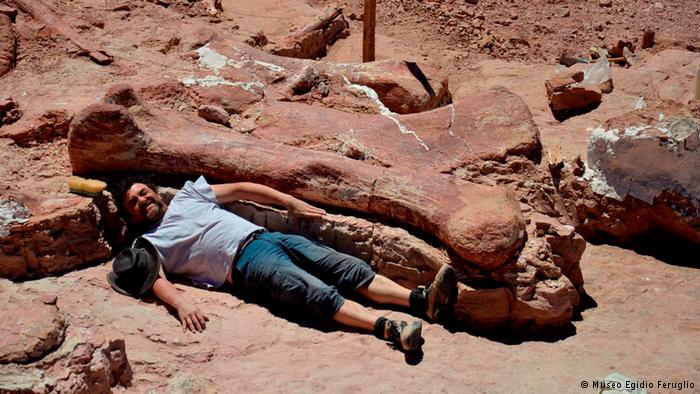 din6 din4 din3 din9 din8 din7 din5 A technician lies next to the femur of a dinosaur at the Egidio Feruglio Museum in Trelew Paleontologists Carballido and Cuneo pose next to the bones of a dinosaur at a farm in La Flecha
