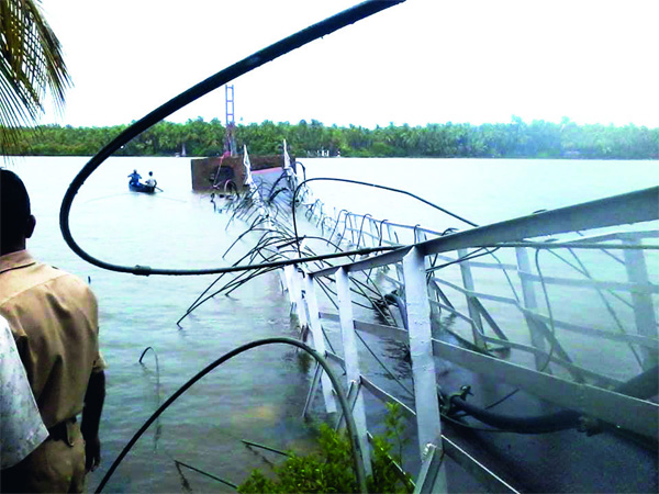 തൃക്കരിപ്പൂർ:രണ്ടു മാസം മുൻപ് ഉത്ഘാടനം ചെയ്ത മാടക്കാൽ തൃക്കരിപ്പൂർ തൂക്കുപാലം തകർന്നു വീണു.രണ്ടു പേർക്ക് പരിക്കേറ്റു.കേരളത്തിലെ ഏറ്റവും വലിയ തൂക്കുപാലമാണിത്.3.94കോടി രൂപ ചെലവിട്ടു പണിത പാലം കഴിഞ്ഞ ഏപ്രിൽ 29ന് റവന്യൂമന്ത്രി അടൂർ പ്രകാശ് ആണു ഉത്ഘാടനം ചെയ്തത്. വ്യാഴാഴ്ച ഉച്ചയ്ക്കു 12.35നാണു പാലത്തിന്റെ കിഴക്കുഭാഗത്തെ 29മീറ്റർ ഉയരമുള്ള തൂൺ തകർന്നു വീണത്.ഇടയിലക്കാട്ടെ എം.കെ മധുസൂദനൻ, തൃക്കരിപ്പൂർ കടപ്പുറത്തെ എം.പ്രഭാകരൻ എന്നിവർക്കാണ് കായലിൽ വീണ് പരിക്കേറ്റത്. പൊതുമേഖലാ സ്ഥാപനമായ കെൽ സബ് കോണ്ട്രാക്ടർ മാരെ വെച്ചാണ് പാലത്തിന്റെ നിർമ്മാണം പൂർത്തിയാക്കിയത്. ഔദ്യോഗിക കൈമാറ്റത്തിനും അവസാന ബില്ല് മാറുന്നതിനും മുമ്പേയാണ് മാടക്കാൾ തൂക്കു പാലം തകർന്നത്. 3.94 കോടി രൂപ ചെലവിട്ട തൂക്കുപാലം നാട്ടുകാർക്ക് ഉപകാരപ്പെട്ടത് 2 മാസം മാത്രമാണ് .