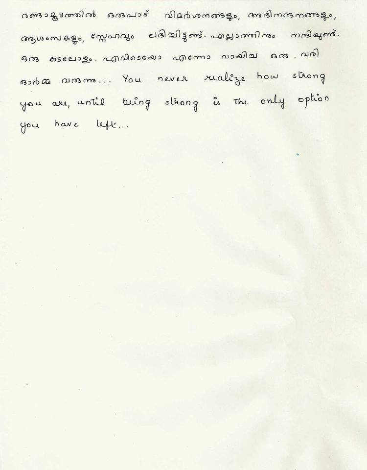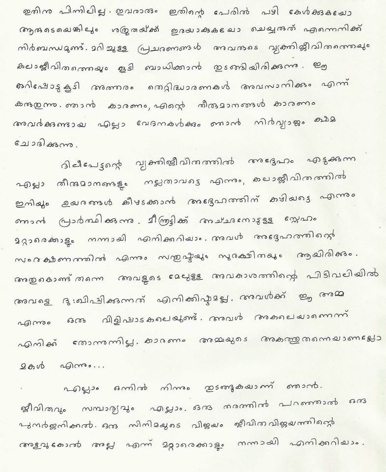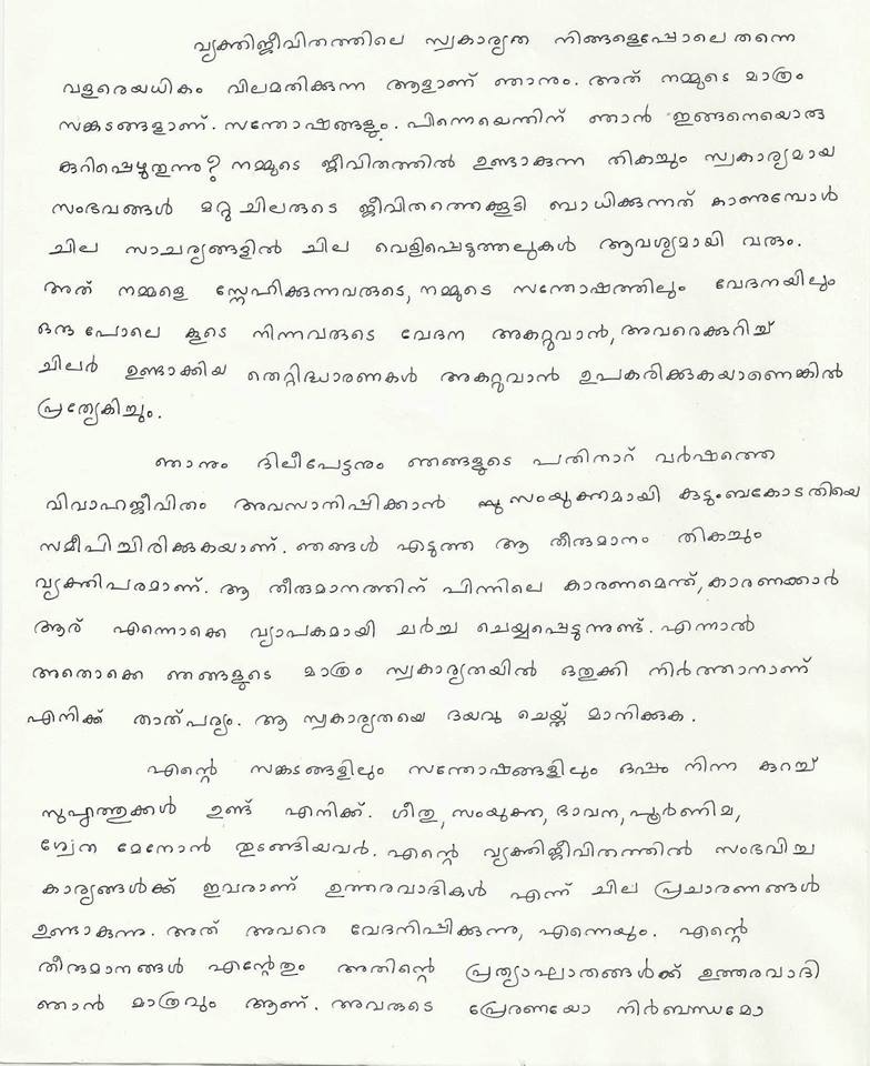 കൊച്ചി : വിവാഹ മോചനം നേടുന്നതിൻറെ വിശദീകരണം മഞ്ജു വാര്യർ വെളിപ്പെടുത്തുന്നു. തൻറെ ഫേസ്ബുക്ക് പോസ്റ്റിലൂടെയാണ് ഇതിനെ കുറിച്ചുള്ള വിശദീകരണം മഞ്ജു നൽകിയത്. എന്നാൽ ദിലീപുമായുള്ള വിവാഹബന്ധം വേര്പ്പെടുത്തുന്നതിനുള്ള കാരണം ഇതിൽ വിശദമായി പറയുന്നില്ല. മൂന്ന് പേജ് അടങ്ങുന്ന കത്താണ് മഞ്ജു തൻറെ ഫേസ്ബുക്കിൽ പ്രസിദ്ദീകരിച്ചിരിക്കുന്നത്. ഞങ്ങൾ എടുത്ത തീരുമാനം തികച്ചും വ്യക്തിപരമാണെന്നും അതൊക്കെ ഞങ്ങളുടെമാത്രം സ്വകാര്യതയില് ഒതുക്കി നിര്ത്താനാണ് എനിക്ക് താല്പര്യമെന്നും മഞ്ജു പറഞ്ഞു. എന്റെ വ്യക്തി ജീവിതത്തില് സംഭവിച്ച കാര്യങ്ങള്ക്ക് ഗീതു, സംയുക്ത, ഭാവന, പൂര്ണിമ, ശ്വേത മേനോന് എന്നിവരാണ് ഉത്തരവാദികൾ എന്ന് ചില പ്രചാരണങ്ങൾ ഉണ്ടായിട്ടുണ്ട്.അത് എന്നെയും അവരെയും വേദനിപ്പിക്കുന്നെന്നും എൻറെ തീരുമാനങ്ങൾ എന്റേതു മാത്രമാണെന്നും അതിൻറെ പ്രത്യാഘാതങ്ങൾക്ക് ഞാൻ മാത്രമാണ് ഉത്തരവാദിയെന്നും മഞ്ജു പറഞ്ഞു.മീനുട്ടിക്ക് അച്ഛനോടുള്ള സ്നേഹം മറ്റാരേക്കാളും നന്നായിട്ട് തനിക്ക് അറിയാമെന്നും അതുകൊണ്ടാണ് മകള്ക്കു വേണ്ടി അവകാശവാദം ഉന്നയിക്കാതിരിക്കുന്നതെന്നും മഞ്ജു പറയുന്നു. മകള് അച്ഛനോടൊപ്പം സന്തോഷവതിയായിരിക്കുമെന്ന പൂര്ണ്ണവിശ്വാസമുണ്ടെന്നും അവളുടെ അമ്മ അവള്ക്കരികില് ഒരു വിളിപ്പാടകലെ തന്നെയുണ്ടാകുമെന്നും മഞ്ജു ഇതിലെഴുതിയിട്ടുണ്ട്.കൂടാതെ ദിലീപേട്ടൻറെ വ്യക്തിജീവിതത്തില് അദ്ദേഹം എടുക്കുന്ന എല്ലാ തീരുമാനങ്ങളും നല്ലതാവട്ടെയെന്നും കലാജീവിതത്തില് ഇനിയും ഉയരങ്ങളിലെത്താൻ കഴിയട്ടെ എന്നും മഞ്ജു തൻറെ ഫേസ്ബുക്ക് പോസ്റ്റിൽ എഴുതി.