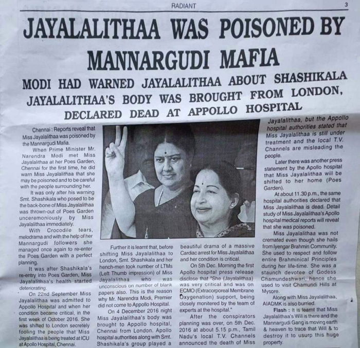 ലണ്ടനിലെ ‘റേഡിയന്റ് ‘ എന്ന പത്രത്തിലെ ഒരു വാര്ത്തയാണ് ഇപ്പോള് പ്രചരിക്കുന്നത്. സെപ്തംബര് 22 ന് പനിയും നിര്ജ്ജലീകരണവും മൂലം അപ്പോളോയില് പ്രവേശിക്കപ്പെട്ട ജയലളിതയെ അവിടുത്തെ ചികിത്സ ഫലിക്കാതിരുന്നതിനെ തുടര്ന്ന് ലണ്ടനില് എത്തിച്ചുവെന്നാണ് പത്രത്തിലെ റിപ്പോര്ട്ടിലുള്ളത്.