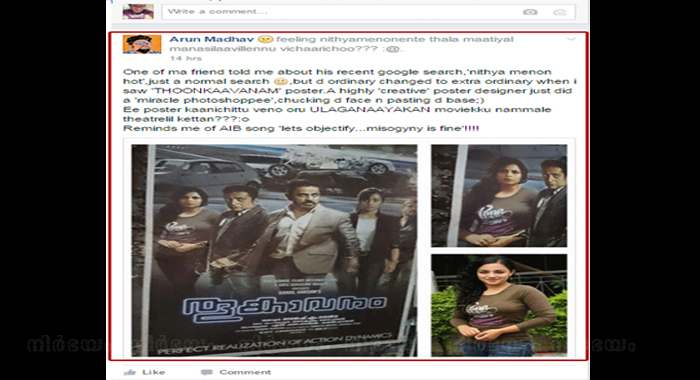 ഉലകനായകൻ കമലഹാസന്റെ പുതിയ ആക്ഷൻ ത്രില്ലറായ തൂങ്കാവനത്തിന്റെ പോസ്റ്റർ വിവദാത്തിൽ. ചിത്രത്തിന്റെ പോസ്റ്ററില് നടി ആശാ ശരത്തിന്റെ തലയും നിത്യാ മേനോന്റെ ഉടലും ചേർത്ത് വച്ചതാണ് വിവാദത്തിന് കാരണമായിരിക്കുന്നത്. സിനിമയുടെ മലയാളം പോസ്റ്ററുകളിലാണ് ഇങ്ങനെ പ്രത്യക്ഷപ്പെട്ടിരിക്കുന്നത്. സക്കറിയയുടെ ഗര്ഭിണികള് എന്ന ചിത്രത്തിലെ ആശയുടെ ചിത്രമാണ് പോസ്റ്ററിലുള്ളത്. ചിത്രത്തിൽ നിത്യാമേനോൻ അഭിനയിക്കുന്നില്ല.സോഷ്യല് മീഡിയയിലെ സിനിമാ ഗ്രൂപ്പുകളില് ഇപ്പോള് ഇതു സംബന്ധിച്ച ചര്ച്ചകള് ആരംഭിച്ചിട്ടുണ്ട്. ദൃശ്യത്തിന്റെ തമിഴ് പതിപ്പായ പാപനാശത്തിന് ശേഷം ആശാ ശരത് കമല് ഹാസനൊപ്പം അഭിനയിക്കുന്ന തമിഴ് ചിത്രമാണ് തൂങ്കാവനം. ചിത്രത്തില് കമലിന്റെ ഭാര്യയുടെ വേഷമാണ് ആശാ ശരത് അഭിനയിക്കുന്നത്. പ്രകാശ് രാജ്, തൃഷ എന്നിവരാണ് ചിത്രത്തിലെ മറ്റ് താരങ്ങൾ.