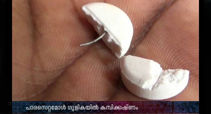 പ്രാഥമികാരോഗ്യകേന്ദ്രത്തില് നിന്നു ലഭിച്ച പാരസെറ്റമോള് ഗുളികയില് കമ്പിക്കഷ്ണം. ചെറുകോട് സ്വദേശി തോരപ്പ മായിൻ മകന് വേണ്ടി, മലപ്പുറം പോരൂര് പ്രാഥമികാരോഗ്യകേന്ദ്രത്തില് നിന്നു വാങ്ങിച്ച ഗുളികയില് നിന്നാണ് കമ്പിക്കഷ്ണം കിട്ടിയത്.