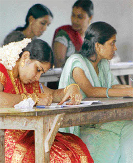പത്തനംതിട്ട:വിവാഹവേഷത്തില് വധു പി.എസ്.സി പരീക്ഷയെഴുതാൻ പരീക്ഷ ഹാളിലെത്തി.മലയാലപ്പുഴ ഐശ്വര്യയില് സൗമ്യ പുരുഷോത്തമനാണ് വിവാഹവേഷത്തിൽ പരീക്ഷയെഴുതിയത്.പി.എസ്.സി. നടത്തിയ സ്റ്റാഫ് നഴ്സ് ഗ്രേഡ് രണ്ടിന്റെ പരീക്ഷയായിരുന്നു ശനിയാഴ്ച 2 മുതല് 3.15 വരെ നടന്നത്.വരന് കൈപ്പട്ടൂര് പാലനില്ക്കുന്നതില് പ്രിന്സിനോടൊപ്പമാണ് സൗമ്യ സ്കൂളിലെത്തിയത്.പരീക്ഷ കഴിഞ്ഞ ശേഷമാണ് വധു വരൻറെ വീട്ടിലേക്ക് പോയത്.മലയാലപ്പുഴ ദേവീക്ഷേത്രത്തില് 11.30നായിരുന്നു ഇവരുടെ വിവാഹം. വരൻറെ വീട്ടിൽ വധു കയറേണ്ട സമയം വൈകീട്ട് അഞ്ചു മണിക്ക് മുമ്പായിരുന്നു.