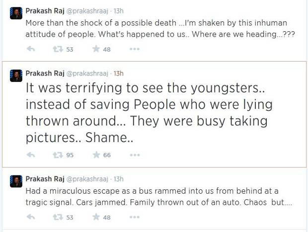 ഹൈദരാബാദ്:നടന്‍ പ്രകാശ് രാജ് കാര്‍ അപകടത്തില്‍ നിന്ന് അദ്ഭുതകരമായി രക്ഷപ്പെട്ടു. ചൊവ്വാഴ്ച രാത്രി ഹൈദരാബാദിലെ ഹൈടെക്ക് സിറ്റിയിൽ ട്രാഫിക്കിൽ നിർത്തിയിട്ടിരുന്ന കാറിന് പിന്നിൽ ബസ് വന്ന് ഇടിക്കുകയായിരുന്നു.അപകടത്തെ തുടർന്ന് അല്പ നേരത്തേയ്ക്ക് ഭയന്നെങ്കിലും പരിക്കേൽക്കാതെ രക്ഷപ്പെട്ടുവെന്ന് പ്രകാശ് രാജ് ട്വിറ്ററിൽ കുറിച്ചു. ഷൂട്ടിങ് കഴിഞ്ഞ് ഫാം ഹൗസിലേക്ക് പോകുമ്പോഴാണ് അപകടമുണ്ടായത്.എന്നാൽ സ്ഥലത്ത് എത്തിയ യുവാക്കൾ തന്നെ രക്ഷിക്കാൻ ശ്രമിക്കുന്നതിനു പകരം തന്റെ ചിത്രങ്ങൾ ക്യാമറയിൽ പകർത്താനാണ് ശ്രമിച്ചതെന്ന് പ്രകാശ് രാജ് ട്വീറ്റ് ചെയ്തു. എന്തുകൊണ്ടാണ് നമ്മൾ ഇങ്ങനെ ചെയ്യുന്നത്. മനുഷ്യത്വരഹിതമായ ഈ പെരുമാറ്റം തന്നെ അസ്വസ്ഥനാക്കുന്നു. എന്താണ് സമൂഹത്തിൽ സംഭവിച്ചുകൊണ്ടിരിക്കുന്നതെന്നും പ്രകാശ് രാജ് ട്വിറ്ററിലൂടെ പറഞ്ഞു.