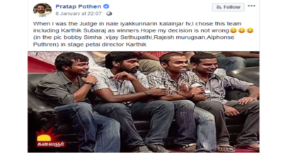 കാർത്തിക് സുബ്ബരാജിന്റെ നേതൃത്വത്തിലുള്ള സംഘമായിരുന്നു അന്ന് ആ റിയാലിറ്റി ഷോയിൽ വിജയികളായത്. പ്രതാപ് പോത്തനാണ് ഈ ടീമിനെ തിരഞ്ഞെടുത്തതും. രജനികാന്തിനെ നായകനാക്കി കാർത്തിക് സംവിധാനം ചെയ്ത പേട്ട വലിയ വിജയത്തിലേക്ക് കുതിക്കുമ്പോൾ പ്രതാപ് പോത്തന്റെ ഈ കുറിപ്പും സമൂഹമാധ്യമങ്ങളിൽ വൈറലാണ്.