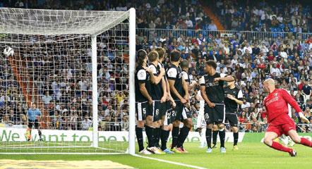 മൂന്നാം മിനിറ്റില് റൗള് ആല്ബിയോളിന്െറ ഗോളില് റയലാണ് മുന്നിലെത്തിയത്. ലൂക്കാ മോഡ്രിച്ചിന്െറ കോര്ണര് കിക്കില് ഹെഡറുതിര്ത്തായിരുന്നു റൗളിന്െറ ഗോള്. കളി കാല്മണിക്കൂറാകവേ, ആതിഥേയ പ്രതിരോധത്തിന്െറ കെട്ടുപൊട്ടിച്ചു ചാടിയ പരഗ്വെ സ്ട്രൈക്കര് റോക്ക് സാന്റാ ക്രൂസ് മലാഗയെ ഒപ്പമെത്തിച്ചു. ഇരുനിരും ഒപ്പത്തിനൊപ്പം മുന്നേറിയ മത്സരത്തില് മലാഗ മാനസികമായി തളര്ന്നത് 21ാം മിനിറ്റിലാണ്. റൊണാള്ഡോയെ വീഴ്ത്തിയതിന് ഡിഫന്ഡര് സെര്ജിയോ സാഞ്ചസ് ചുകപ്പുകാര്ഡ് കണ്ട് പുറത്തായതിനു പുറമെ റയലിന് പെനാല്റ്റി കിക്കും ദാനമായിക്കിട്ടി. എന്നാല്, റൊണാള്ഡോയുടെ കിക്ക് എതിര്ഗോളി വിലി കബാല്ലെറോ കാലുകൊണ്ട് തടഞ്ഞിട്ടു.