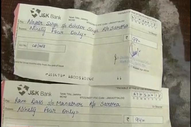 സരോര:ജമ്മു കശ്മീരില് 2014ലുണ്ടായ പ്രളയത്തില് കൃഷി നാശം സംഭവിച്ച കര്ഷകര്ക്ക് നഷ്ടപരിഹാരമായി ലഭിച്ചത് 47 രൂപ മുതല് 378 രൂപവരെ.ജമ്മുവിലെ സരോര ഗ്രാമത്തിലെ കർഷകർക്കാണു നഷ്ടപരിഹാരമായി ഇത്രയും കുറഞ്ഞ തുകയുടെ ചെക്ക് ലഭിച്ചത്. ഇവർക്ക് ഏറ്റവും കൂടുതൽ ലഭിച്ച തുക 378 രൂപയും കുറഞ്ഞ തുക 47 രൂപയുമാണ്. ഇത്തരത്തിൽ 25 ചെക്കുകളാണ് കാർഷിക ഇൻസ്പെക്ടർ ഗ്രാമത്തിൽ വിതരണം ചെയ്തത്.കുപിതരായ കർഷകർ സംസ്ഥാന ഗവൺമെന്റിനെതിരെ പ്രതിഷേധ പരിപാടിക്ക് ഒരുങ്ങുകയാണ്.വലിയ രീതിയിൽ വിളവ് നശിച്ച തങ്ങളെ അപമാനിക്കുന്ന തരത്തിലുള്ള നഷ്ടപരിഹാരമാണ് ഗവൺമെന്റ് തന്നതെന്ന് കർഷകർ ആരോപിച്ചു. ചെക്കിന് വേണ്ടി തങ്ങൾ കാത്തിരിക്കുകയായിരുന്നു, എന്നാൽ 47,50,94,92 എന്നിങ്ങനെയുള്ള തുകയാണ് തങ്ങൾക്ക് ലഭിച്ചത്. എല്ലാം ഒരു തമാശ പോലെ തോന്നുന്നു. തങ്ങൾക്ക് 30000 നഷ്ടപ്പെട്ടപ്പോൾ 100 രൂപയുടെ ചെക്ക് ലഭിച്ചിരിക്കുന്നെന്ന് അവർ പരിതപിച്ചു. 2014 സെപ്തംബറിൽ സംസ്ഥാനത്തുണ്ടായ വെള്ളപ്പൊക്കത്തിൽ മുന്നൂറോളം പേർക്ക് ജീവൻ നഷ്ടപ്പെടുകയും ആയിരക്കണക്കിന് പേർക്ക് വീട് നഷ്ടപ്പെടുകയും ചെയ്തിരുന്നു.