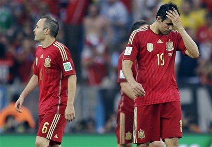 റിയോ ഡി ജനീറോ: നിലവിലെ ചാമ്പ്യന്മാരായ സ്പെയ്ന് ലോകകപ്പില് നിന്നും പുറത്തായി.എതിരില്ലാത്ത രണ്ട് ഗോളിന് ചിലിയാണ് സ്പെയിനെ തോല്പ്പിച്ചത്. ഗ്രൂപ്പ് ബിയില് നിന്നും രണ്ട് ജയങ്ങള് വീതം നേടിയ ഹോളണ്ടും ചിലിയും പ്രീക്വാര്ട്ടറില് കടന്നു.ആദ്യ മത്സരത്തില് ഹോളണ്ടിനോട് 5-1ന് പരാജയപ്പെട്ട ലോക ചാമ്പ്യന്മാര് ലാറ്റിനമേരിക്കന് രാജ്യമായ ചിലിയോടും പരാജയപ്പെട്ടതോടെയാണ് ലോകകപ്പിന്റെ പ്രാഥമിക റൗണ്ടില് തന്നെ പുറത്തായത്. കളി മറന്നവരെ പോലെ മൈതാനത്ത് ഉഴറിനടന്ന സ്പാനിഷ് പടയുടെ പിഴവ് മുതലെടുത്ത് ഇരുപതാം മിനിറ്റില് എഡ്വേര്ഡോ വാഗാസ് ചിലിയുടെ ആദ്യ ഗോള് നേടി.