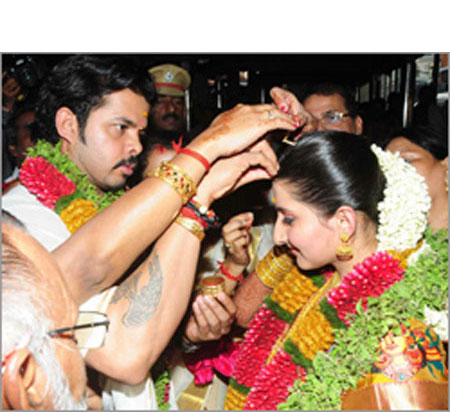 ഗുരുവായൂര് :മലയാളി ക്രിക്കറ്റ് താരം എസ്.ശ്രീശാന്ത് വിവാഹിതനായി.രാജസ്ഥാനിലെ ദിവാന്പുര രാജകുടുംബത്തിലെ ഭുവനേശ്വരി കുമാരി(നയന്)യാണ് വധു.ഇന്നു രാവിലെ ഗുരുവായൂര് ക്ഷേത്രത്തില് 7.30നും 8നും ഇടയിലുള്ള ശുഭ മുഹൂര്ത്തത്തിലാണ് ശ്രീ നയനു താലി ചാര്ത്തിയത്.2006 മുതല് ഇരുവരും പ്രണയത്തിലായിരുന്നു.അടുത്ത ബന്ധുക്കള് മാത്രമാണ് ഗുരുവായൂരിലെ വിവാഹ ചടങ്ങുകളില് പങ്കെടുത്തത്.താലി ചാര്ത്തല് ചടങ്ങ് മാത്രമാണ് ഗുരുവായൂരില് നടന്നത്.ഇന്നു വൈകുന്നേരം കൊച്ചി ലേ മെറിഡിയനില് ബന്ധുക്കള്ക്കും സുഹൃത്തുക്കള്ക്കുമായി വിവാഹസത്കാരം നടക്കും.കഴിഞ്ഞ തിങ്കളാഴ്ച തന്നെ വധുവും കുടുംബാംഗങ്ങളും കൊച്ചിയിലെത്തിയിരുന്നു.ശനിയാഴ്ച ശ്രീശാന്തിന്റെ ജന്മനാടായ കോതമംഗലത്തും വിവാഹസത്ക്കാരം നടക്കും.2007 നവംബര് 18ന് പാക്കിസ്താനെതിരായ ഏകദിനമത്സരം കളിക്കാന് ജയ്പൂരിലെത്തിയപ്പോഴാണ് ഇരുവരും ആദ്യമായി കാണുന്നത്.ഓട്ടോഗ്രാഫ് വാങ്ങാനെത്തിയ പരിചയമാണ് പ്രണയത്തിലും ഒടുവില് വിവാഹത്തിലും കലാശിച്ചത്.ശ്രീശാന്ത് കോഴവിവാദത്തില് അകപ്പെട്ടപ്പോഴും പെണ്കുട്ടിയും കുടുംബവും പൂര്ണപിന്തുണയുമായി ഒപ്പമുണ്ടായിരുന്നു.3 ദിവസം നീളുന്ന വിവാഹാഘോഷങ്ങള് കൊച്ചിയില് സംഘടിപ്പിച്ചിരിക്കുന്നത്.രാജസ്ഥാനില് നിന്ന് 100 ഓളം പേരാണ് ചടങ്ങില് പങ്കെടുക്കാന് എത്തിയിരിക്കുന്നത്.ചടങ്ങുകള്ക്ക് ശേഷം ശ്രീശാന്തിന്റെ ജന്മാനാടായ കോതമംഗലത്തേക്കാണ് ഇരുവരും പോയത്.