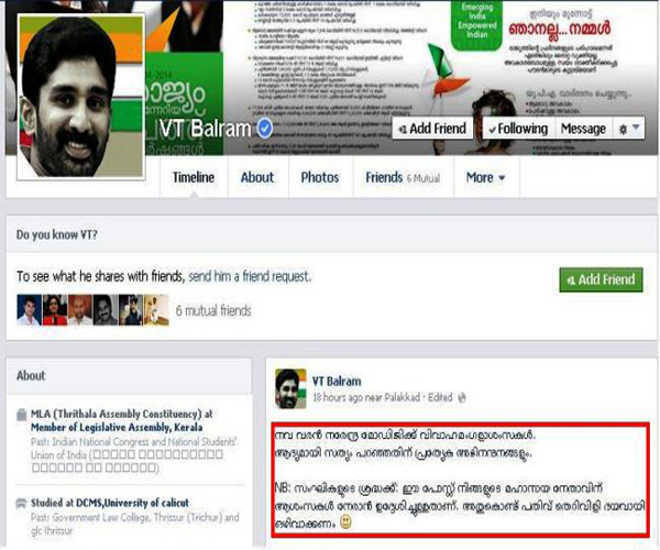 പാലക്കാട്: ബിജെപിയുടെ പ്രധാനമന്ത്രി സ്ഥാനാര്ഥി നരേന്ദ്ര മോദിക്കെതിരെ വി.ടി. ബല്റാം എംഎല്എയുടെ ഫേസ്ബുക്ക് പോസ്റ്റ് പുതിയ പോരിന് വഴിതുറന്നു.മോദിക്ക് വിവാഹാശംസകള് നേര്ന്നുകൊണ്ട് പരിഹാസരൂപേണ ഇട്ട പോസ്റ്റാണ് ഇപ്പോൾ പുതിയൊരു വിവാദത്തിന് തിരികൊളുത്തിയത്ത്.അതിനിടെ ബല്റാമിനെ അനുകൂലിച്ച് ഒരു വിഭാഗം രംഗത്തുവന്നതോടെ ബല്റാമിന്റെ പേജില് പൊരിഞ്ഞ പോരാട്ടമാണ് നടക്കുന്നത്. സംഘികളുടെ ശ്രദ്ധക്ക്: ഈ പോസ്റ്റ് നിങ്ങളുടെ മഹാനായ നേതാവിന് ആശംസകള് നേരാന് നേരാന് ഉദ്ദേശിച്ചുള്ളതാണ്. അതുകൊണ്ട് പതിവ് തെറിവിളി ദയവായി ഒഴിവാക്കണം.- എന്നാണ് ബല്റാം പോസ്റ്റ് ചെയ്തിരിക്കുന്നത്. ഇന്നലെയാണ് സ്റ്റാറ്റസ് അപ്ഡേറ്റ് ചെയ്തിരിക്കുന്നത്. മൂവായിരത്തിലധികം ലൈക്കുകളും അഞ്ഞൂറിലധികം ഷെയറുകളും ഇതിനോടകം ഈ പോസ്റ്റിന് ലഭിച്ചു കഴിഞ്ഞു.എഴുന്നൂറിലധികം കമന്റുകളാണ് പോസ്റ്റിനെ അനുകൂലിച്ചും പ്രതികൂലിച്ചും ലഭിച്ചിരിക്കുന്നത്.