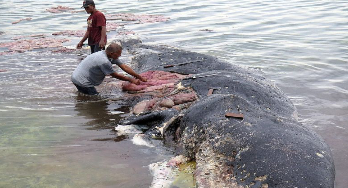 ജക്കാര്ത്ത: ഇന്ഡോനേഷ്യയില് ചത്തനിലയില് കണ്ടെത്തിയ ഭീമന് തിമിംഗലത്തിന്റ വയറ്റില് നിന്ന് കണ്ടെത്തിയത് 6 കിലോ ഭാരമുള്ള പ്ലാസ്റ്റിക് മാലിന്യം. വക്കാതോബി ദേശീയപാര്ക്കിന്റെ ഭാഗമായ കപോട്ടാ ദ്വീപിനോട് ചേര്ന്നുള്ള പ്രദേശത്തുനിന്നാണ് തിമിംഗലത്തെ കണ്ടൈത്തിയത്. ആറ് കിലോയോളം പ്ലാസ്റ്റിക് മാലിന്യമാണ് 9.5 മീറ്റര് നീളമുള്ള തിമിംഗലത്തിന്റെ വയറ്റില് കണ്ടെത്തിയത്. 115 പ്ലാസ്റ്റിക് കപ്പ്, നാല് പ്ലാസ്റ്റിക് കുപ്പികള്, 25 പ്ലാസ്റ്റിക് ബാഗുകള്, രണ്ട് ചെരുപ്പുകള് കൂടാതെ 1000 പ്ലാസ്റ്റിക് വള്ളികള് എന്നിവയാണ് വയറ്റില് നിന്ന് കണ്ടെടുത്തത്.