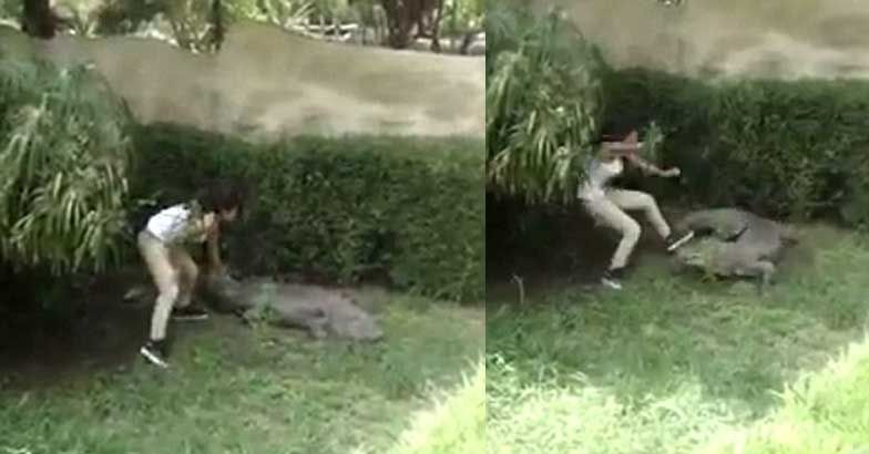 മറ്റു സന്ദര്ശകർക്കൊപ്പം നിൽക്കുകയായിരുന്ന യുവതി വേലിചാടി മുതലയുടെ അടുത്തേക്ക് എത്തി. തുടർന്ന് തൊട്ടുനോക്കാൻ ശ്രമിച്ചപ്പോൾ മുതല യുവതിയ്ക്കു നേരെ തിരിയുകയായിരുന്നു. ഇതോടെ വേലി ചാടികടന്ന് യുവതി ജീവനും കൊണ്ട് ഓടി.