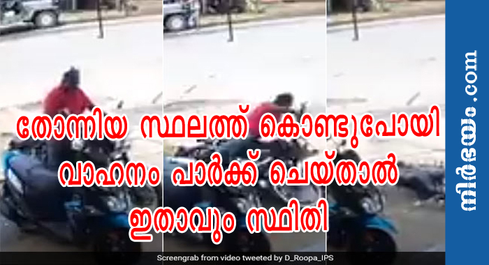 ഒരു സ്ഥാപനത്തിന് മുമ്പിൽ ഇനി വാഹനം പാർക്ക് ചെയാൻ സ്ഥലമില്ല. ഒരലപ്പം സ്ഥലം അവശേഷിക്കുന്നുണ്ട്. അവിടെ വാഹനം തിരുകിക്കയറ്റാൻ ശ്രമിച്ചതാണ് ഇയാൾ. പറ്റിയത് കണ്ടില്ലേ. ബൈക്ക് പാർക്ക് ചെയ്തപ്പോൾ സ്റ്റാൻഡ് വന്നത് നിലത്തെ പ്രതലത്തിനും പുറത്തേക്കായി. അതോടെ വണ്ടിയും ആയാളും എല്ലാം കൂടെ താഴേക്ക് മഞ്ഞു വീഴുകയും ചെയ്തു.